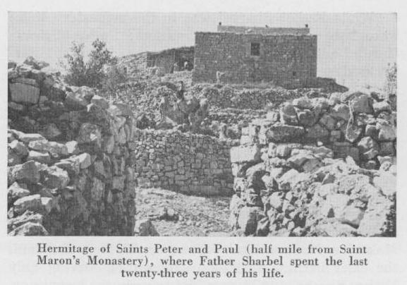 Eid describes the hermitage at the summit of Annaya, appearing "like a globe suspended in the sky, dominating the valleys and surrounding mountains." Dwelling at the hermitage at the time was Elisaus Hardini (Elisha Kassab El Hardini), who died in 1875. Sharbel shared the hermitage with Lebawos Hacklani (Libaos El Ramaty) and, after 1880, with Marsalis Mishmashani (Makarios Sawma El Mishmishani) as well. Additionally, there were attending brothers for each hermit.