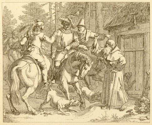 At length the stag, pursued, seeks refuge in the hut of an old hermit; the huntsman wishes to set it on fire in order to drive out his prey; the hermit embraces his knees, and endeavors to soften the ferocious being who thus threatens his humble abode: for the last time, the good genius, under the form of the white knight, again speaks to him; the evil genius, under that of the black knight triumphs; the huntsman kills the hermit, and is at once changed into a phantom, pursued by his own dogs, who seek to devour him.
